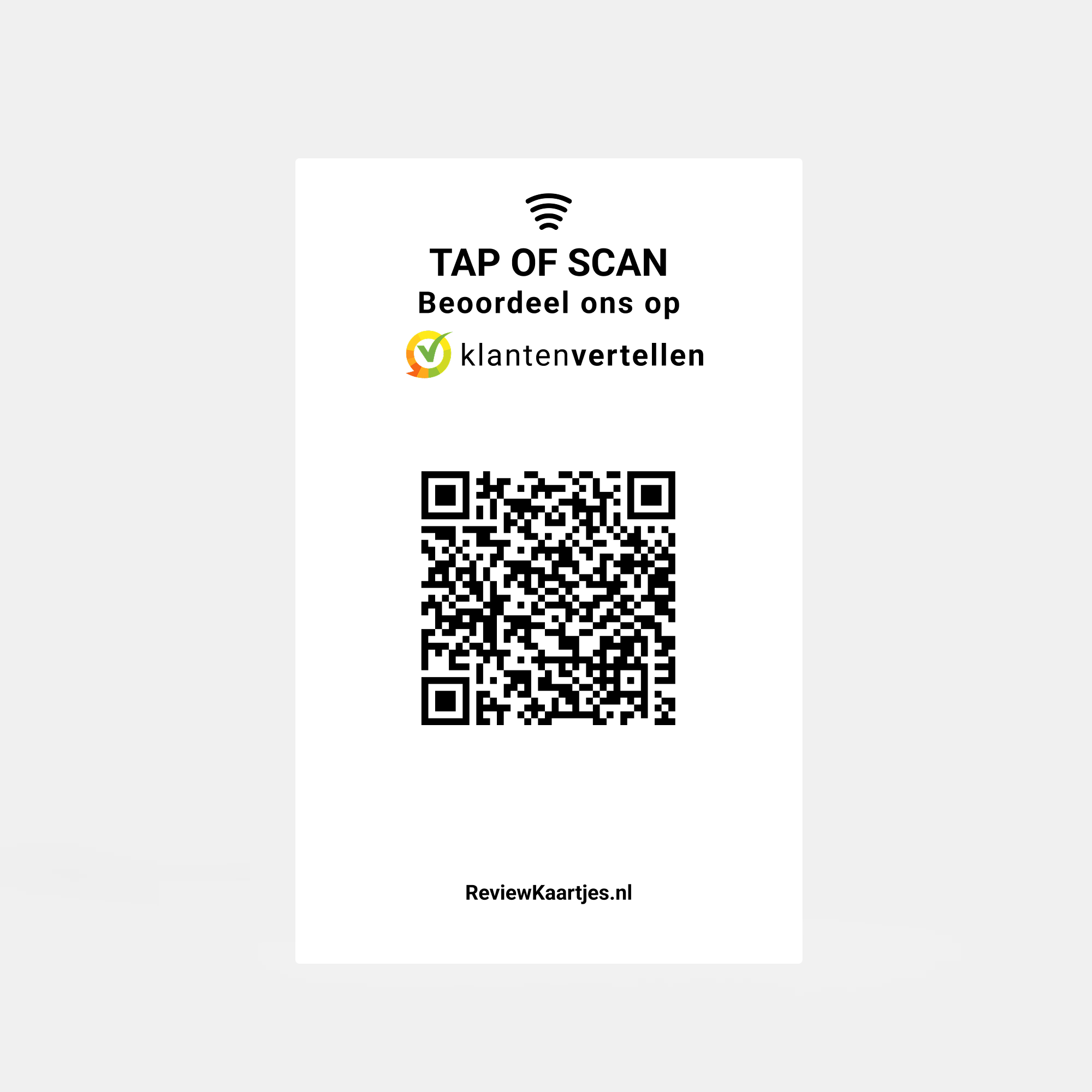 Verzamel razendsnel reviews en verbeter je online reputatie met een Klantenvertellen Review Kaart voorzien van QR code en NFC technologie. Maak het makkelijk voor je klanten om een review achter te laten. Verzamel eenvoudig reviews door QR code te scannen en klanten kunnen direct een review achterlaten. Met QR / NFC code gaat het direct naar uw Klantenvertellen bedrijfsvermelding en verloopt nooit. Daarnaast onbeperkt gebruik en geen abonnementskosten.